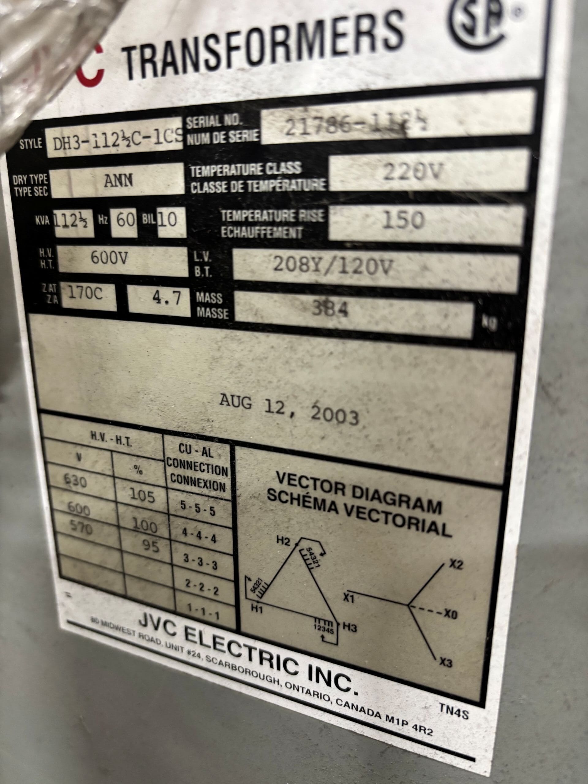 This is a professionally maintained used 112.5 kVA dry-type isolation transformer, designed for indoor applications. It steps down from 600V Delta (primary) to 208Y/120V Wye (secondary), suitable for 3-phase electrical distribution systems.