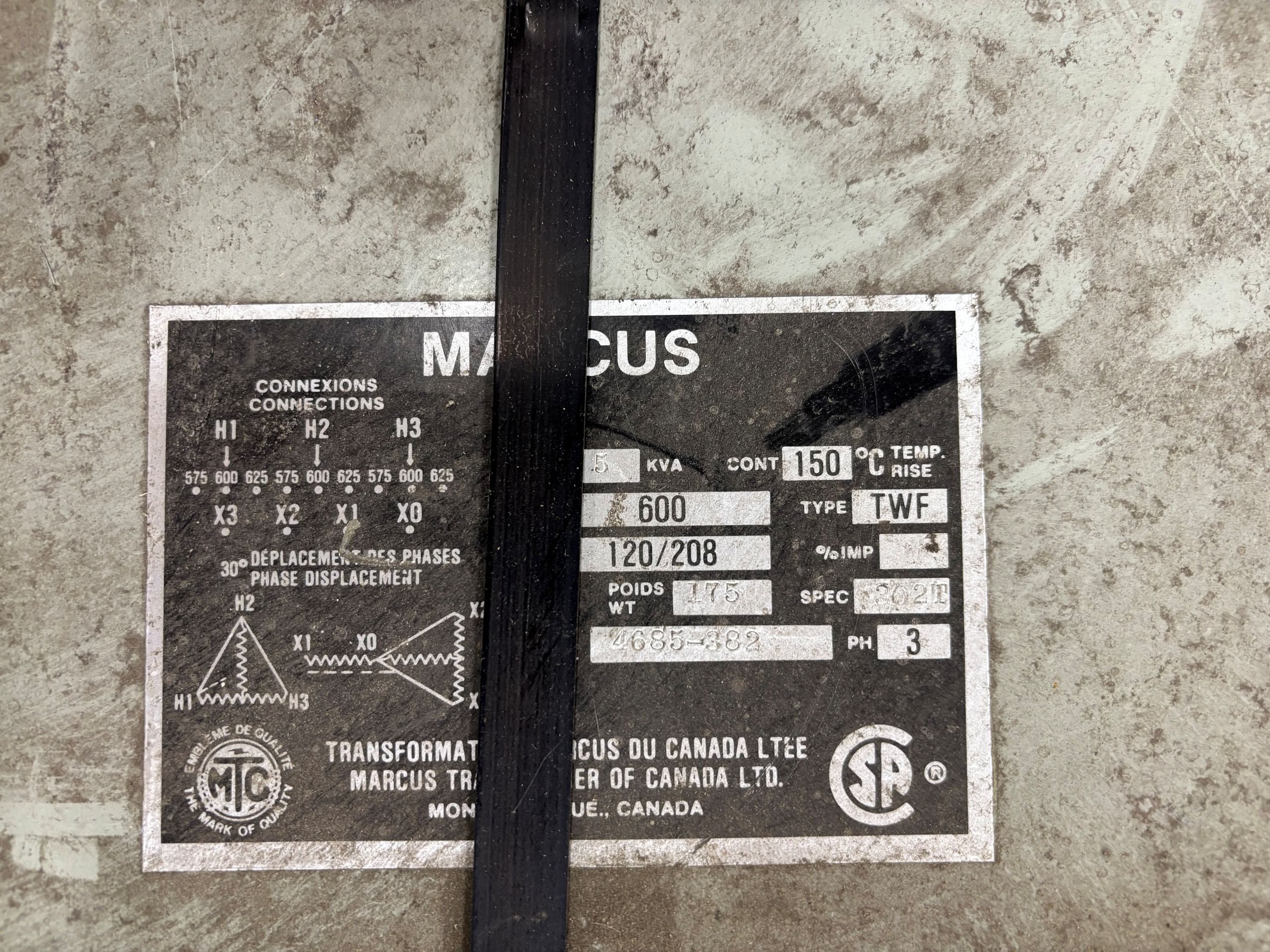 This used 7.5 KVA dry-type isolation transformer is designed for efficient voltage step-down from 600 Delta to 208Y/120V in indoor commercial or light industrial applications. Its 3-phase configuration ensures stable and balanced power distribution for lighting, receptacles, or equipment loads.