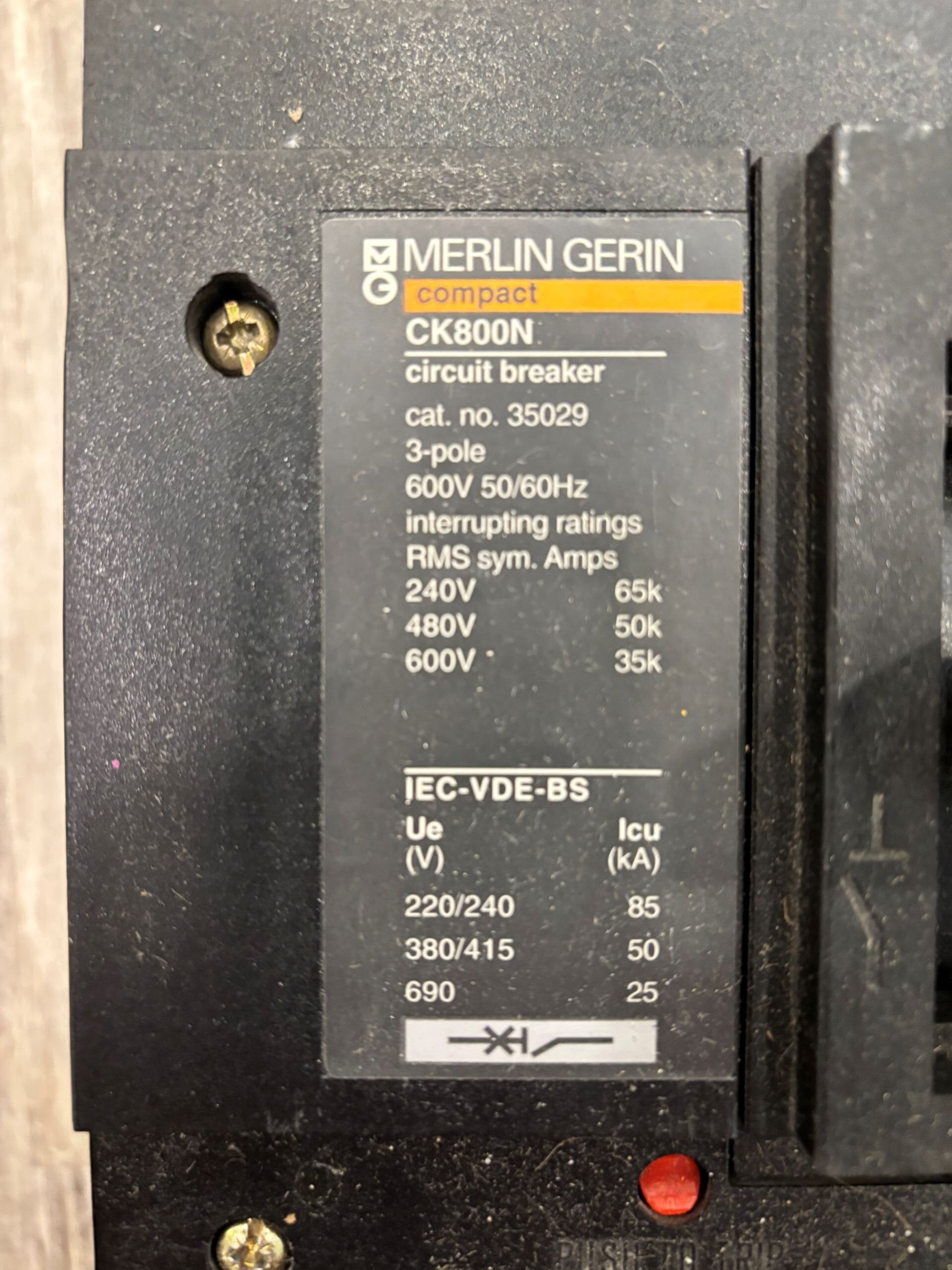 Used Merlin Gerin 800A, 600V, 3-Pole Molded Case Circuit Breaker, Model CK3800N, 35kA interrupting rating. Includes STR 55UP electronic trip unit with LSIG protection functions.