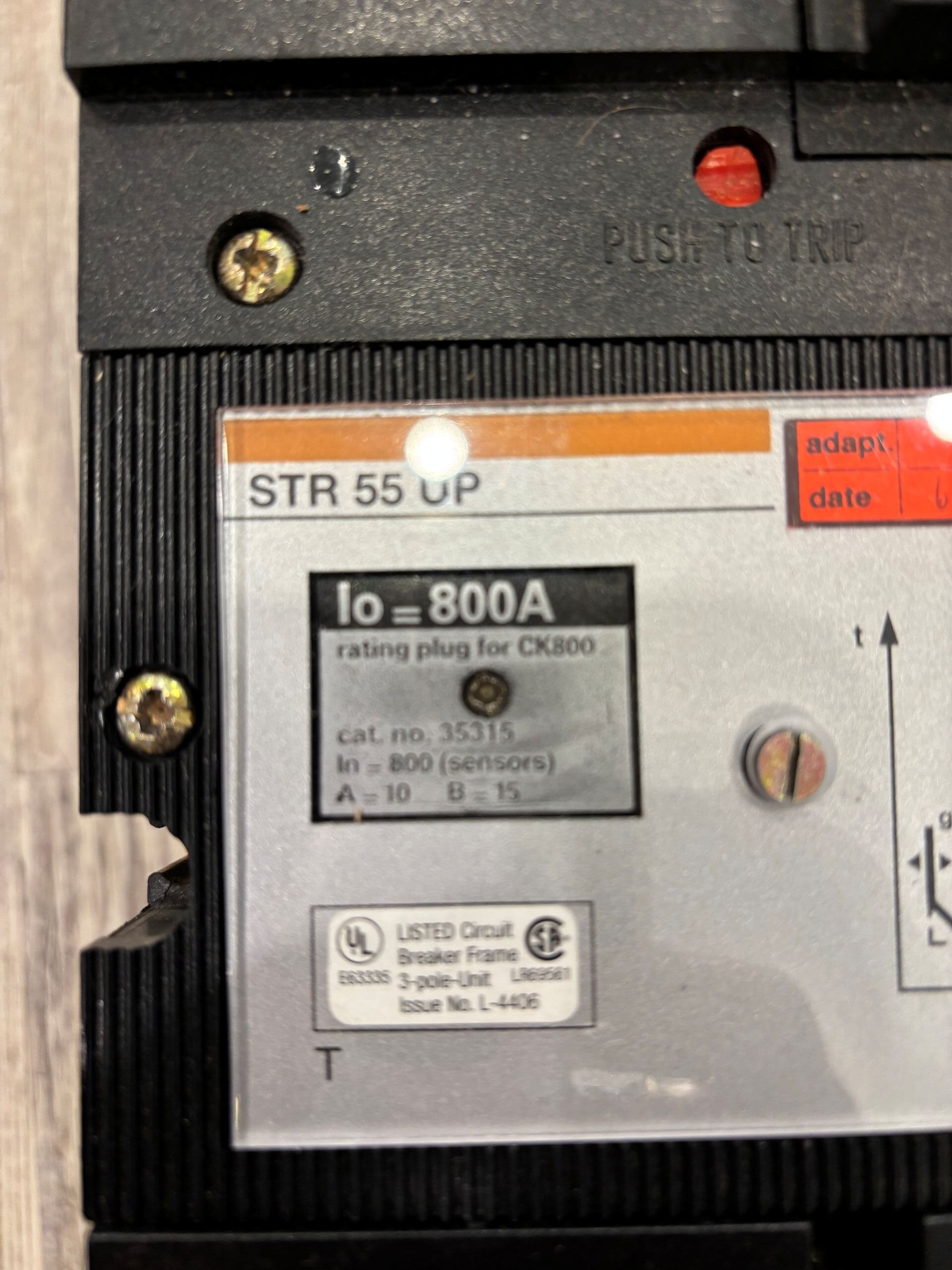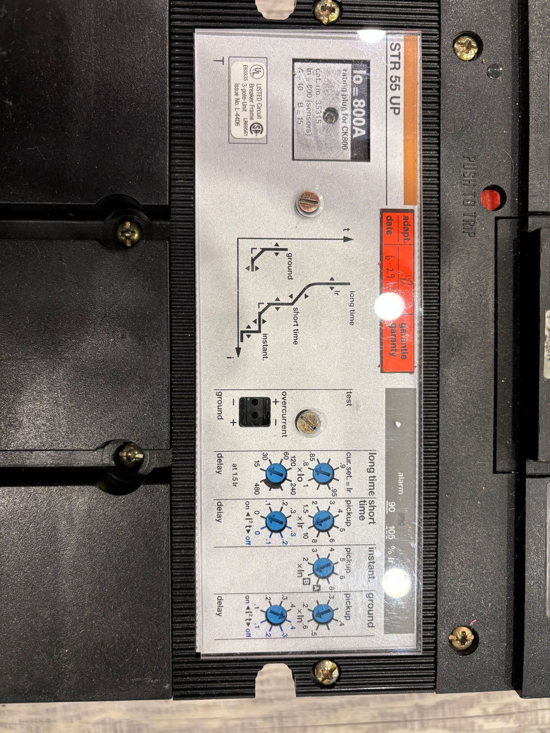 Used Merlin Gerin 800A 600V 3P molded case breaker model CK3800N, 35KA with STR 55UP relay LSIG functions