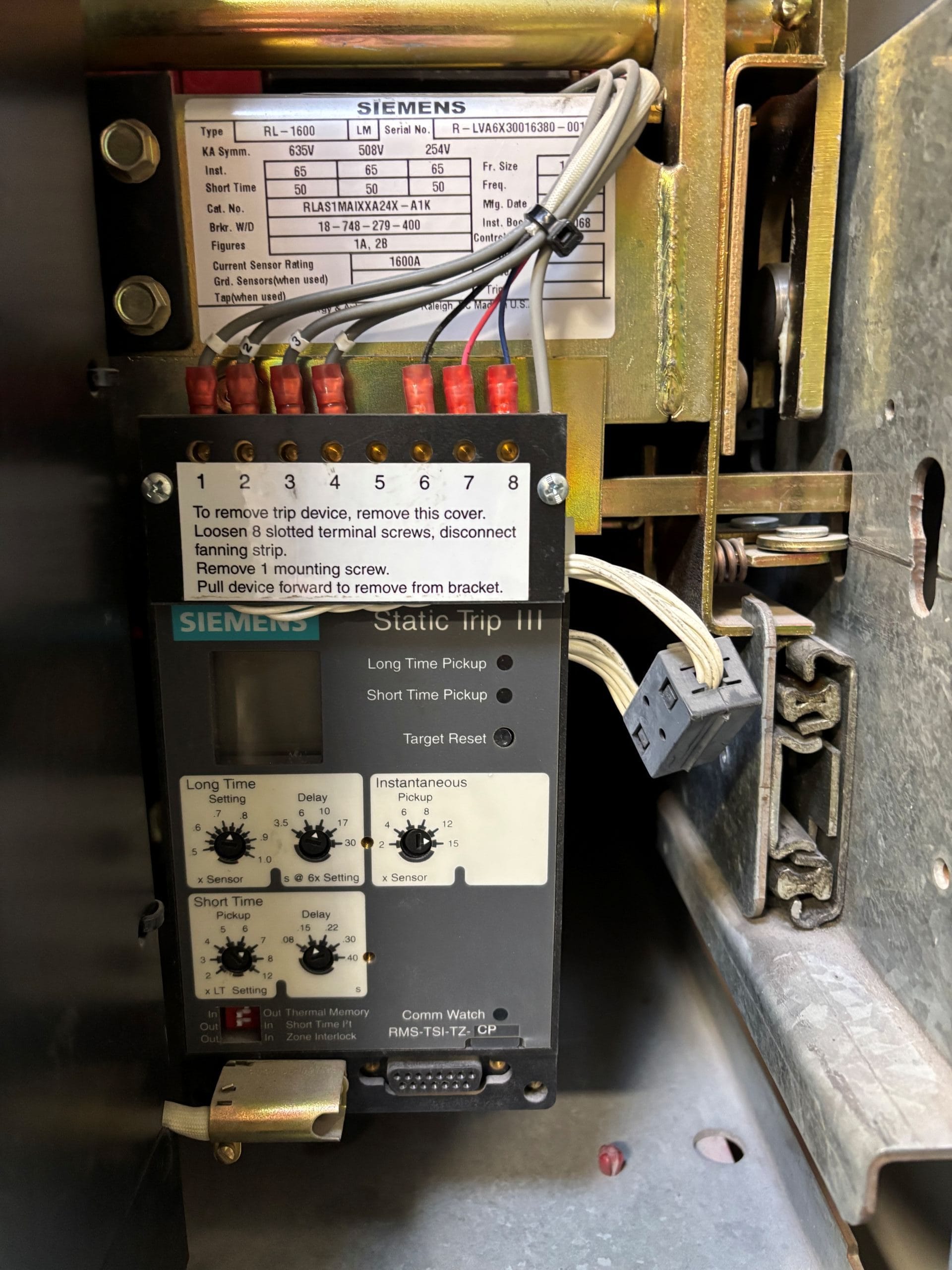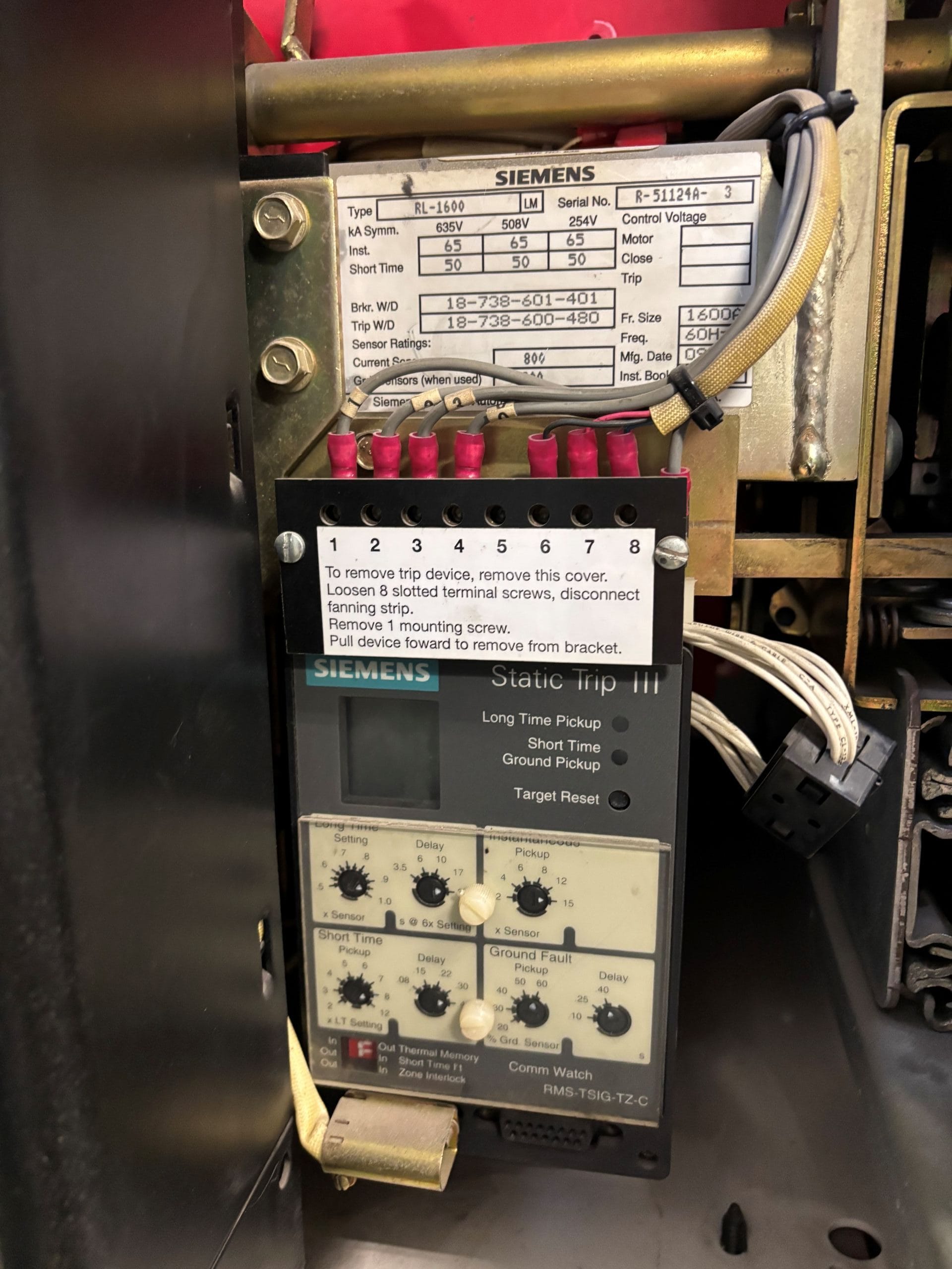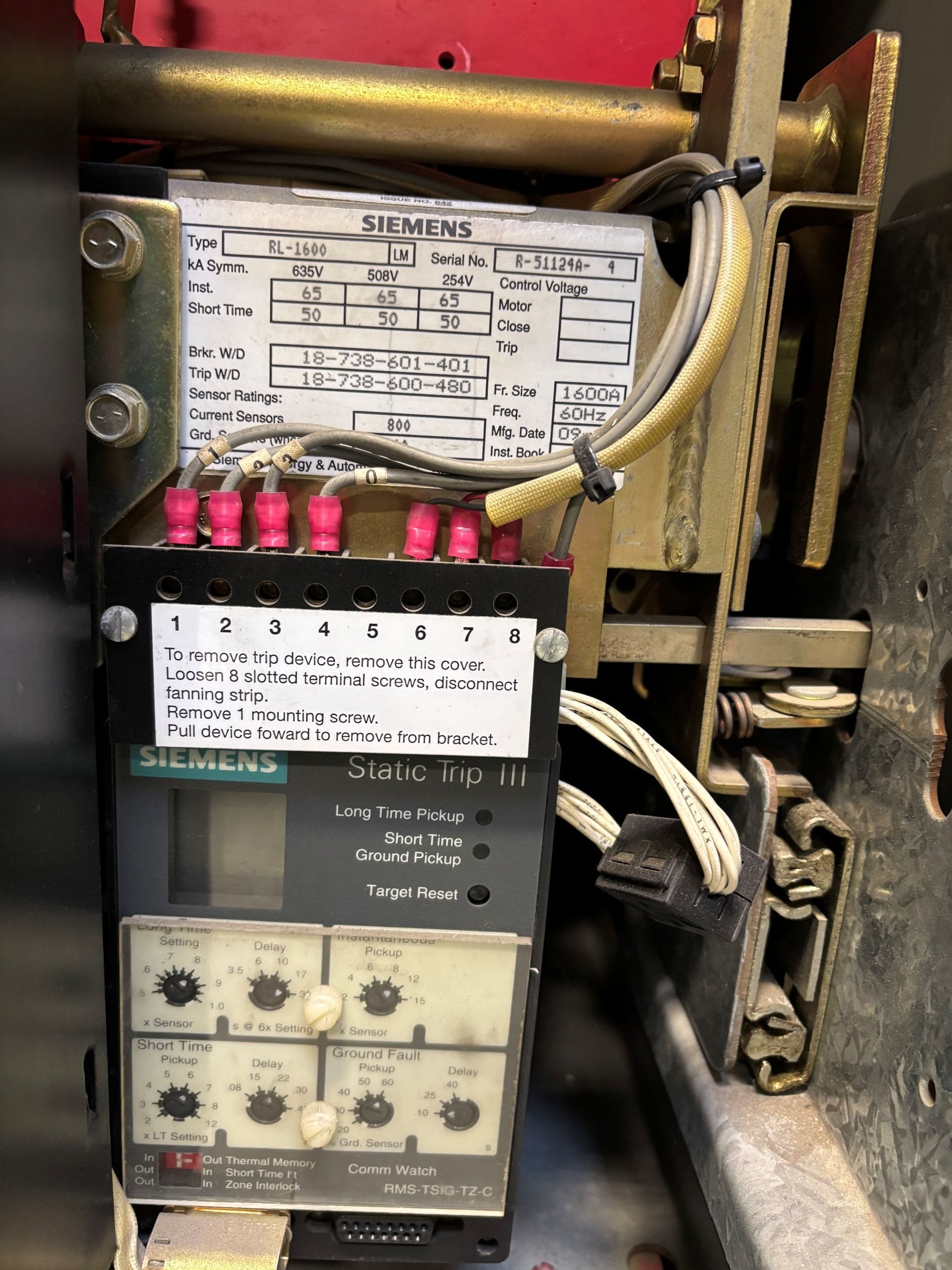 Siemens RL-1600 Air Circuit Breaker – 1600A, 600V, Drawout, Static Trip III LSIG – Used