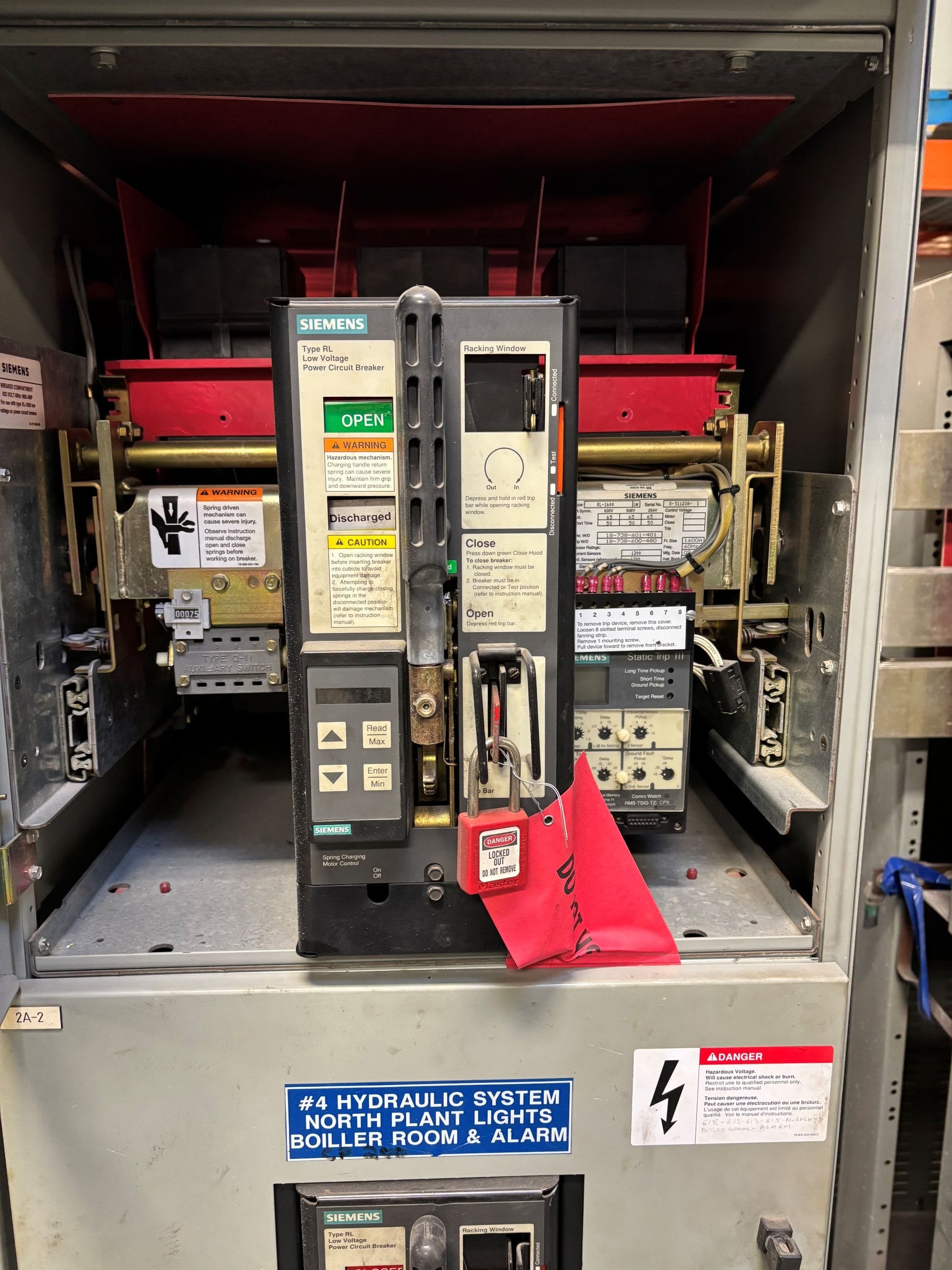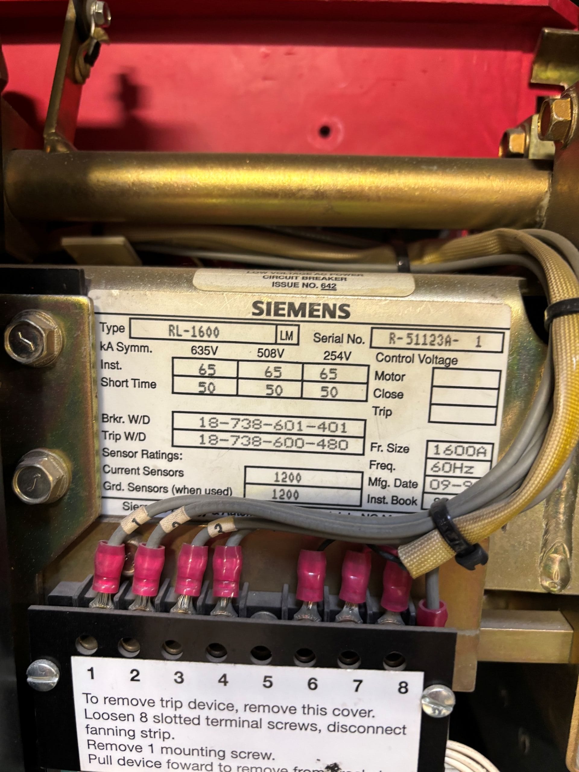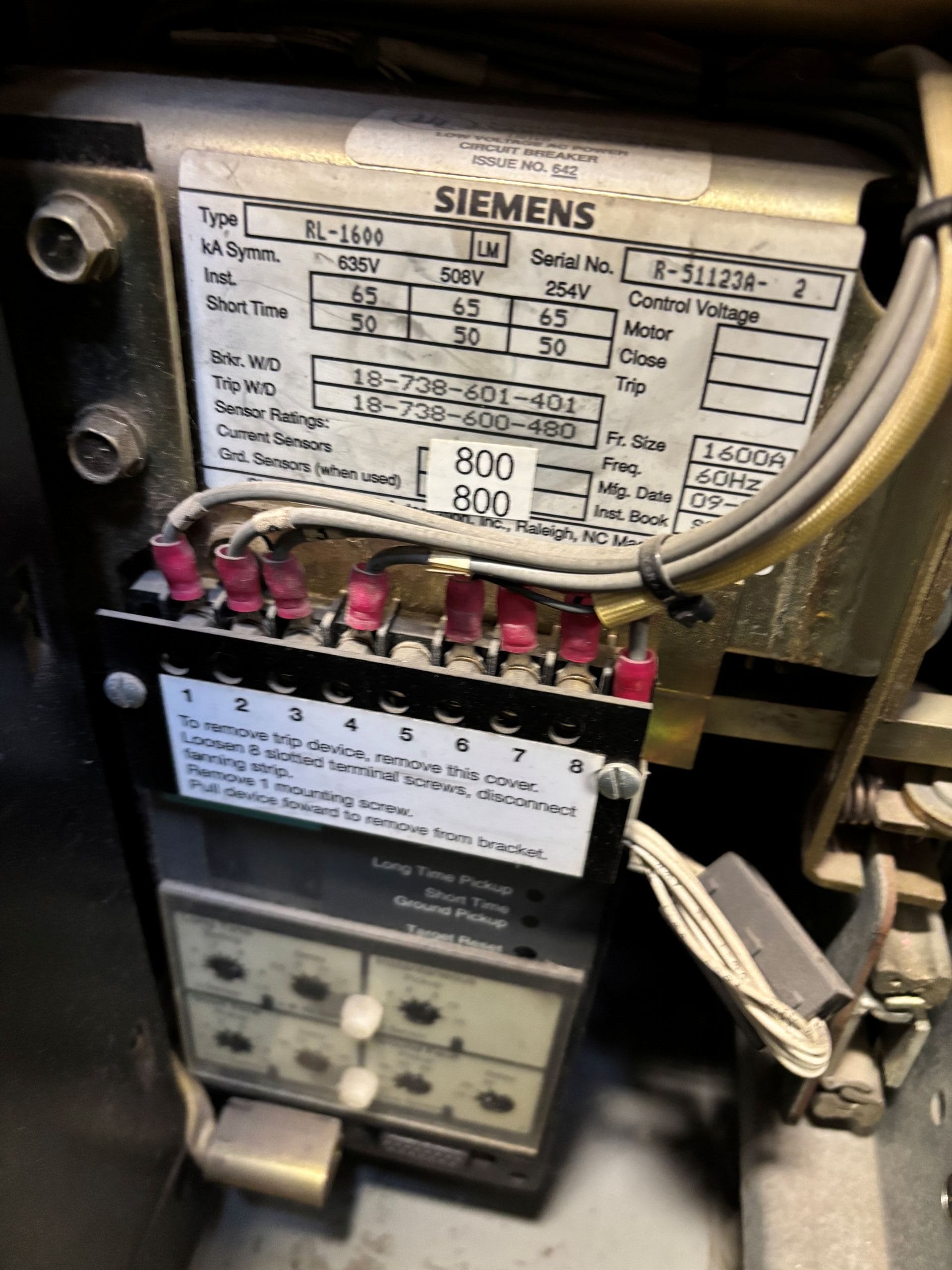 Reliable and fully serviceable Siemens RL-1600 air circuit breaker available for use. This unit is rated at 1600 amps and 600 volts, making it suitable for a wide range of industrial and commercial power distribution systems.